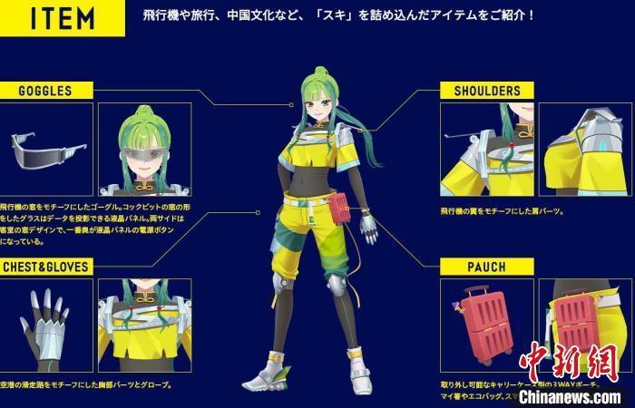 她的頭發(fā)和眼睛是綠色的,因為綠色是公司的代表色。此外,她身上有許多航空元素,護目鏡采用了飛機前窗的樣式,胸口和手套的原型是飛機的滑行道,肩膀上參考了機翼的設計,腰間還掛著一個行李箱樣式的小包。