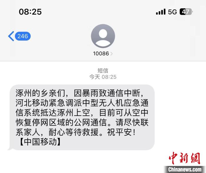 中新網(wǎng)石家莊8月3日電 (郝燁 趙景科)“【中國移動】涿州的鄉(xiāng)親們,因暴雨致通信中斷,河北移動緊急調(diào)派中型無人機(jī)應(yīng)急通信系統(tǒng)抵達(dá)涿州上空,目前可從空中恢復(fù)停網(wǎng)區(qū)域的公網(wǎng)通信。請盡快聯(lián)系家人,耐心等待救援。祝平安!”8月3日早,河北涿州災(zāi)區(qū)的群眾收到一條來自空中的短信。