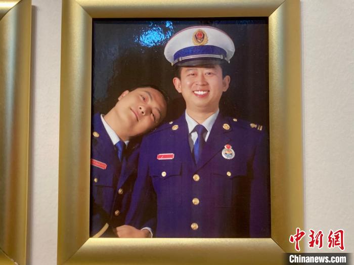 圖為北京市海淀區(qū)北安河消防救援站“笑臉墻”上,馮振(右)和戰(zhàn)友2021年的合照。 中新社記者 徐婧 攝