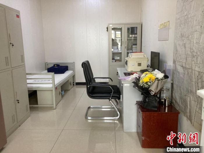 2023年8月,馮振在西小營小型站工作和生活的站長室,墻上貼著馮振和隊員一起繪制的地圖?!≈行律缬浾?徐婧 攝