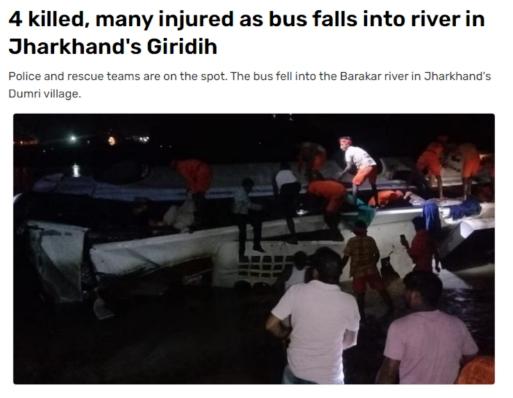 據(jù)報道,當(dāng)?shù)鼐椒Q,當(dāng)晚約20:40,在賈坎德邦(Jharkhand)的吉里迪(Giridih)縣,一輛從蘭契開往吉里迪的大巴車突然撞壞大橋欄桿,隨后墜入河流,橋梁高度約15米,造成至少4人死亡。預(yù)計還有幾人溺水身亡,救援行動正在進(jìn)行中。