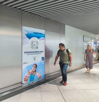 希臘雅典國際機場內(nèi),旅客走過用中文書寫的廣告海報。