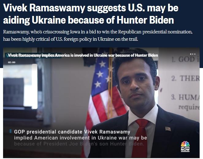 中新網(wǎng)8月8日電 據(jù)美國全國廣播公司(NBC)報道,當?shù)貢r間6日,美國共和黨2024年總統(tǒng)競選人維韋克·拉馬斯瓦米稱,美國參與烏克蘭危機或與拜登家族腐敗有關(guān)。