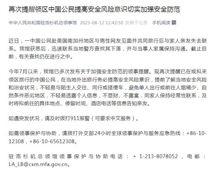 中新網(wǎng)8月12日電 據(jù)中國(guó)駐洛杉磯總領(lǐng)事館官方公眾號(hào)12日消息,近日,一中國(guó)公民赴美國(guó)南加州地區(qū)與男性網(wǎng)友見(jiàn)面并共同旅行后與家人親友失去聯(lián)系。中國(guó)駐洛杉磯總領(lǐng)事館獲悉后,迅速聯(lián)系當(dāng)?shù)鼐讲檎移湎侣洌⑴c當(dāng)事人家屬保持溝通。截至目前,有關(guān)查找仍在進(jìn)行之中。