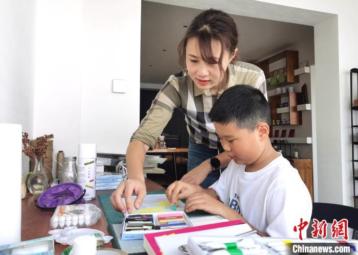8月8日,吳婷婷在指導小朋友畫畫?! ≈行律缬浾?向一鵬 攝