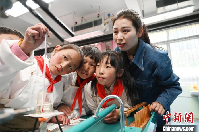 5月18日,四川阿壩州壤塘縣寄宿制學(xué)校學(xué)生在科學(xué)課做實驗?!≈行律缬浾?安源 攝