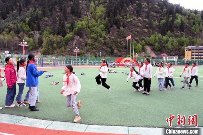 5月17日,四川阿壩州壤塘縣寄宿制學(xué)校的學(xué)生在操場跳繩?!≈行律缬浾?安源 攝