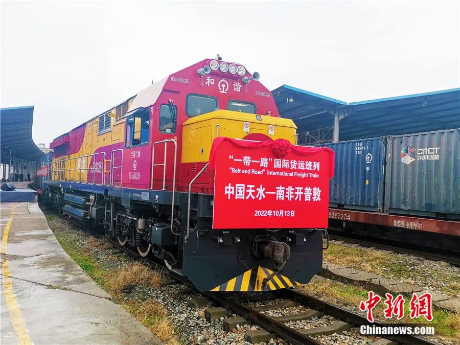 2022年10月13日,“中國(guó)天水—南非開(kāi)普敦”國(guó)際班列順利發(fā)運(yùn)。這是首趟甘肅發(fā)運(yùn)的中國(guó)至非洲農(nóng)產(chǎn)品專列。李志杰 攝