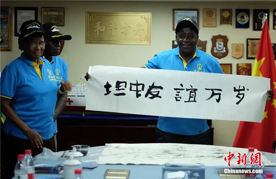 67歲的坦贊鐵路坦方員工秋馬展示自己書寫的“坦中友誼萬(wàn)歲”書法作品。江山 攝