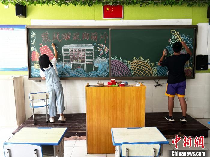 在一間教室里,來(lái)自夏村中學(xué)的教師丁玲正帶著學(xué)生徐俊熙繪制迎接新生的黑板報(bào),有大船、海浪、向日葵等圖案。徐俊熙開(kāi)學(xué)上初二,他對(duì)記者說(shuō):“這個(gè)黑板報(bào)的主題‘乘風(fēng)破浪向前沖’,是為了激勵(lì)同學(xué)們要堅(jiān)強(qiáng)起來(lái),不畏困難,積極向上?!?/p>