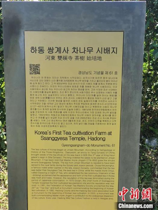 田杰:茶是什么時候、如何傳入韓國的,說法比較多。不過普遍認(rèn)為韓國茶文化是始于朝鮮半島的三國時期。有“新羅善德女王時期萌芽,興德王時期盛行”的說法。據(jù)記載,新羅興德王3年,也就是公元828年,興德王派使臣“大廉”出使中國?;貒臅r候大廉帶回了茶種,新羅王將茶種種在了智異山腳下。之后雙溪寺的僧人將其在寺院周圍培植,形成了大片茶園?,F(xiàn)在全羅道河?xùn)|是韓國綠茶的主要產(chǎn)地之一。在河?xùn)|雙溪寺附近有韓國茶“始培地”,并有碑刻。