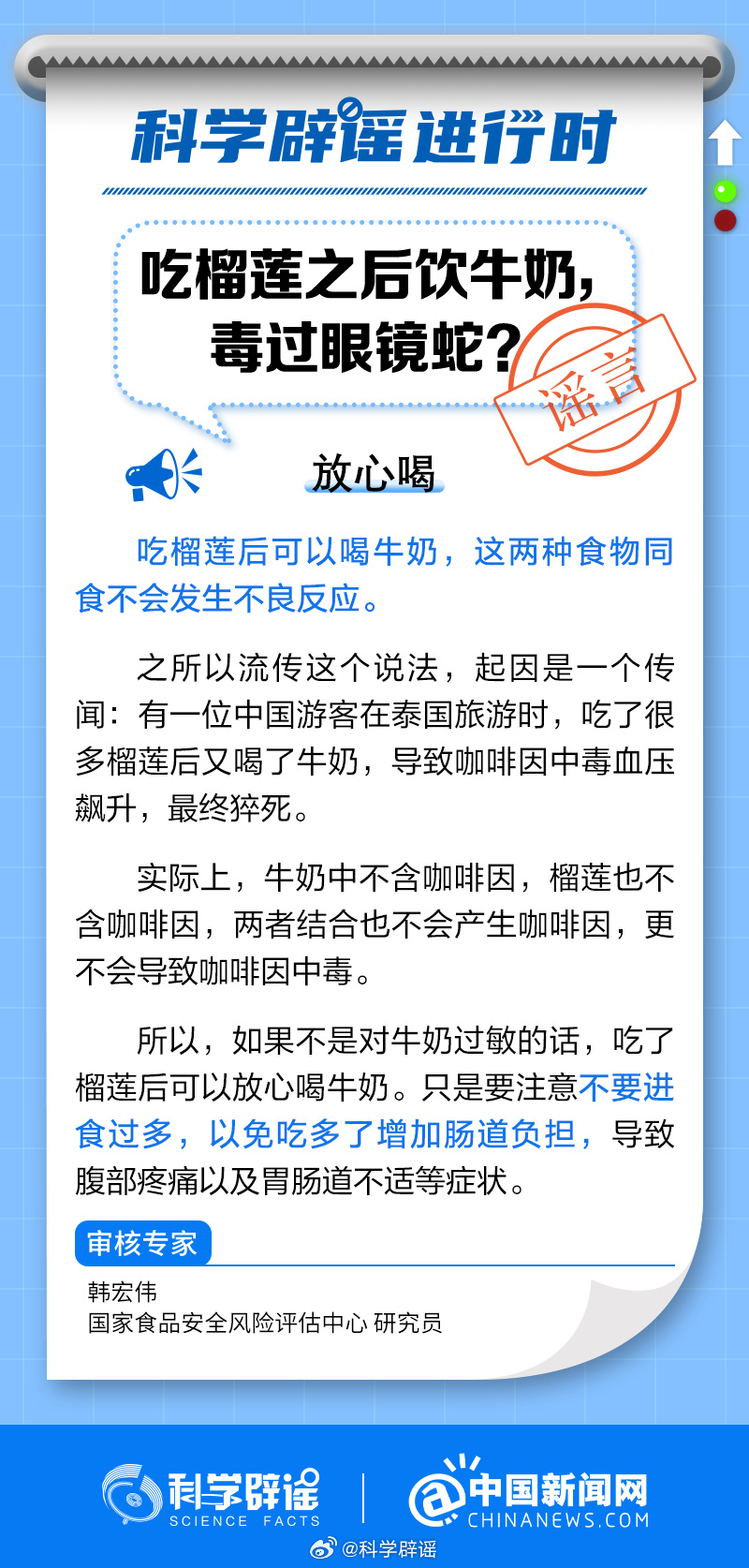 中新網(wǎng)8月24日電 吃榴蓮后可以喝牛奶,這兩種食物同食不會(huì)發(fā)生不良反應(yīng)。之所以流傳這個(gè)說法,起因是一個(gè)傳聞:有一位中國(guó)游客在泰國(guó)旅游時(shí),吃了很多榴蓮后又喝了牛奶,導(dǎo)致咖啡因中毒血壓飆升,最終猝死。實(shí)際上,牛奶中不含咖啡因,榴蓮也不含咖啡因,兩者結(jié)合也不會(huì)產(chǎn)生咖啡因,更不會(huì)導(dǎo)致咖啡因中毒。(來源:@科學(xué)辟謠 @中國(guó)新聞網(wǎng) )