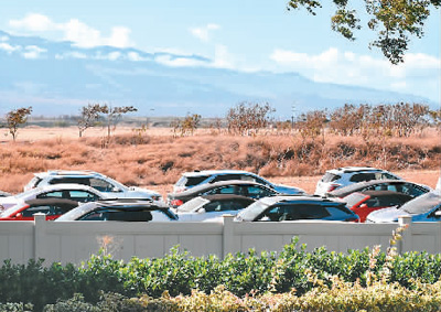 8月24日,美國(guó)夏威夷毛伊島卡胡盧伊機(jī)場(chǎng)外的一片空地上停放著租車(chē)公司沒(méi)有租出去的汽車(chē)。