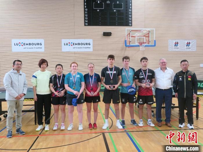 中國駐盧森堡大使華寧(左一)、奧運(yùn)冠軍張怡寧(左二)、閻森(右一)等與參加青年集訓(xùn)營的選手合影留念。中新網(wǎng)發(fā) 中國駐盧森堡使館供圖