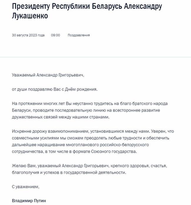 據(jù)報(bào)道,克里姆林宮網(wǎng)站發(fā)布了生日賀電內(nèi)容。賀電中稱,多年來,盧卡申科一直為白俄羅斯的人民利益不懈努力。普京表示真誠珍視同白俄羅斯的互信關(guān)系。