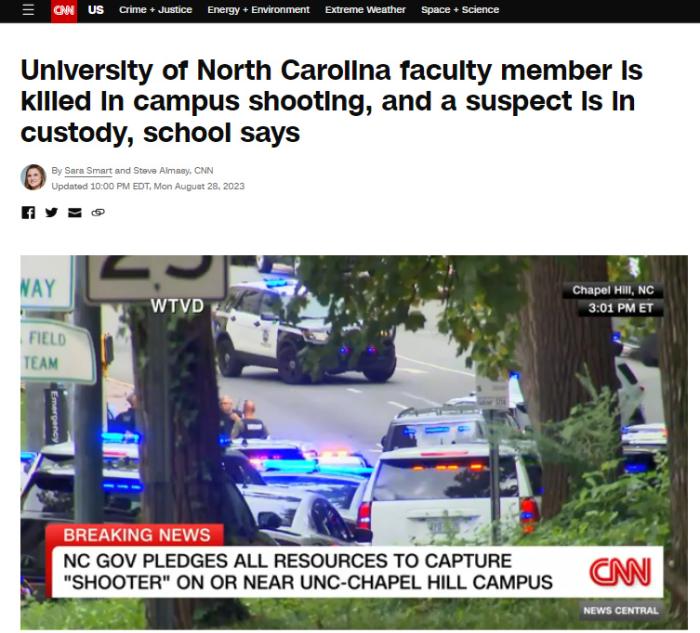 中新網(wǎng)8月29日電 綜合美媒報道,當(dāng)?shù)貢r間28日,美國北卡羅來納大學(xué)教堂山分校發(fā)生一起槍擊事件,造成該校一名教職人員死亡。