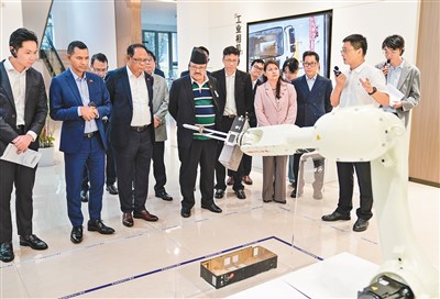 在自動檢測產品外觀缺陷的視覺質檢機器人前,使節(jié)們停下腳步,饒有興致地觀看?;瘕堈f:“在數字經濟推動下,人工智能等技術與傳統(tǒng)工業(yè)深度結合,讓人耳目一新?!?/p>