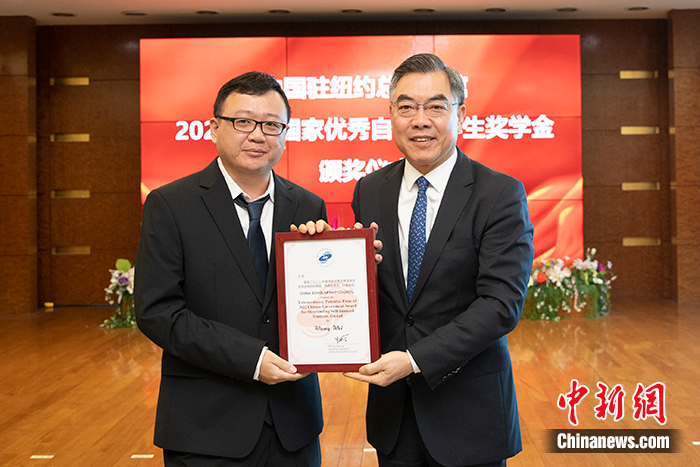 中新社紐約9月2日電 (記者 廖攀)中國駐紐約總領(lǐng)事館2日在紐約駐地舉行2022年度國家優(yōu)秀自費(fèi)留學(xué)生獎學(xué)金頒獎儀式,中國駐紐約總領(lǐng)事黃屏為獲獎學(xué)生頒獎,負(fù)責(zé)教育事務(wù)的參贊余有根介紹紐約領(lǐng)區(qū)獲獎情況。獲獎學(xué)生、評審專家代表等近90人通過線上線下結(jié)合方式出席頒獎儀式。