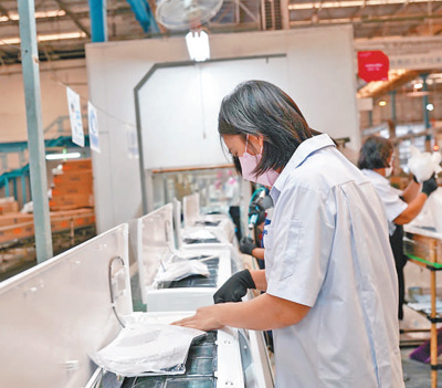 泰國員工在海爾空調生產線進行操作。