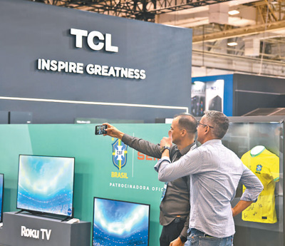 在2023年圣保羅國際消費類電子及家用電器產品展覽會上,參觀者在TCL展臺前合影留念。