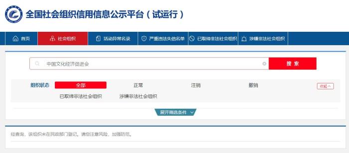 但中新財經(jīng)記者在全國社會組織信用信息公示平臺查詢發(fā)現(xiàn),中國城市雕塑建設(shè)研究院、中國文化經(jīng)濟(jì)促進(jìn)會均未在民政部門登記。