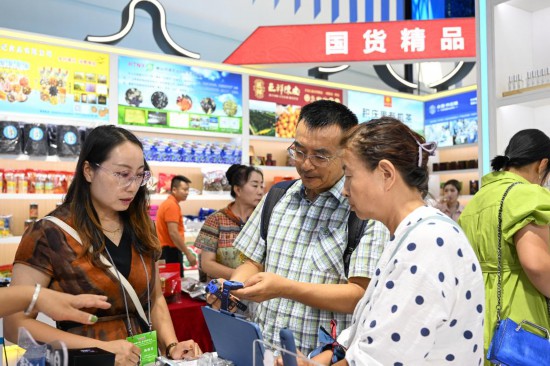 9月6日,游客(中)在第四屆中國—蒙古國博覽會上選購商品。新華社記者 貝赫 攝