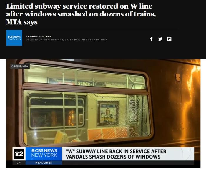 報(bào)道稱,紐約地鐵此前也遭遇過此類破壞,2020年,在兩個(gè)月時(shí)間內(nèi),紐約地鐵7號(hào)線列車約有100扇車窗遭到破壞。