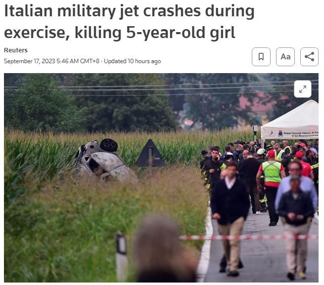 中新網(wǎng)9月17日電 綜合外媒報道,當(dāng)?shù)貢r間16日,意大利空軍“三色箭”飛行表演隊(duì)的一架飛機(jī)在都靈郊外訓(xùn)練時墜毀,導(dǎo)致地面一名5歲女童身亡,飛行員在墜毀前彈射逃生。