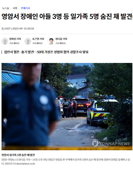 中新網(wǎng)9月15日電 據(jù)韓聯(lián)社報道,當(dāng)?shù)貢r間15日下午,韓國全羅南道靈巖郡一家五口在家中同時身亡,現(xiàn)場到處都是血跡。