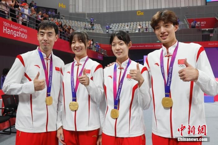 9月25日晚,杭州第19屆亞運(yùn)會(huì)跆拳道競(jìng)技混合團(tuán)體賽決賽在臨安體育文化會(huì)展中心體育館舉行。中國(guó)隊(duì)以84比77戰(zhàn)勝韓國(guó)隊(duì),獲得冠軍。圖為冠軍中國(guó)選手宋兆祥、周澤琪、宋潔、崔陽(yáng)(從左至右)在頒獎(jiǎng)儀式后合影。