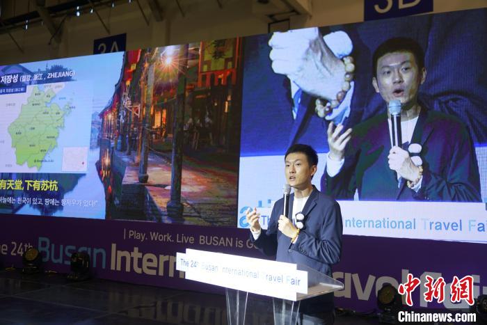 10月5日,第24屆釜山國(guó)際旅游展在韓國(guó)釜山國(guó)際會(huì)展中心開(kāi)幕。圖為浙江文旅韓國(guó)推廣中心主任丁振哲介紹浙江省旅游資源。中新社記者 劉旭 攝
