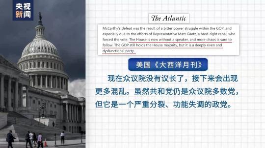 美國《大西洋月刊》評論說,現(xiàn)在眾議院沒有議長了,接下來會(huì)出現(xiàn)更多混亂。雖然共和黨仍是眾議院多數(shù)黨,但它是一個(gè)嚴(yán)重分裂、功能失調(diào)的政黨。