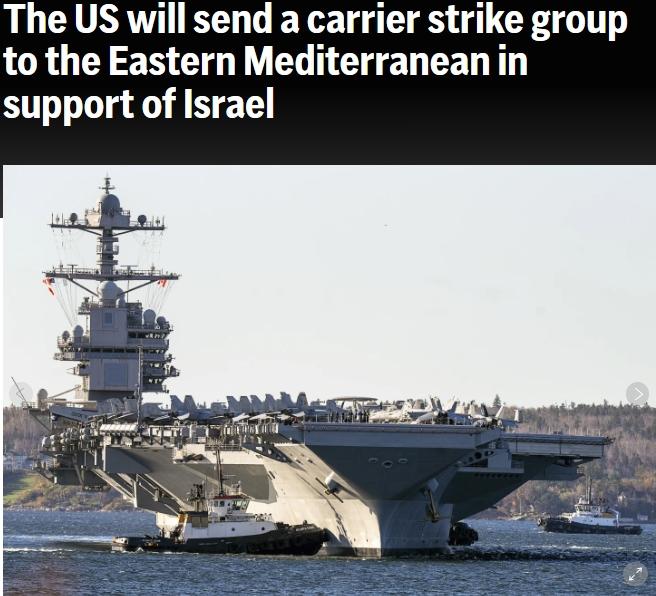 據(jù)美聯(lián)社報(bào)道,當(dāng)天,美國(guó)國(guó)防部長(zhǎng)奧斯汀發(fā)表聲明稱(chēng),他下令“杰拉爾德·R·福特”號(hào)航空母艦戰(zhàn)斗群移至更靠近以色列的東地中海,包括一艘航空母艦、一艘導(dǎo)彈巡洋艦和四艘導(dǎo)彈驅(qū)逐艦,以展示武力,準(zhǔn)備應(yīng)對(duì)任何情況,這些情況包括阻止更多武器送達(dá)巴勒斯坦伊斯蘭抵抗運(yùn)動(dòng)(哈馬斯)以及進(jìn)行監(jiān)視。