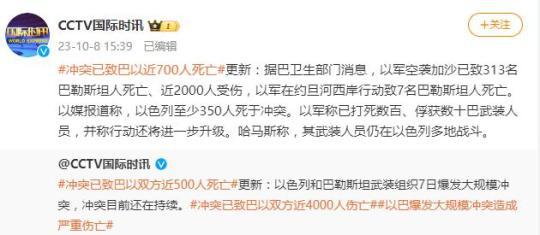 央視網(wǎng)消息:據(jù)CCTV國際時訊微博消息,據(jù)巴衛(wèi)生部門消息,以軍空襲加沙已致313名巴勒斯坦人死亡、近2000人受傷,以軍在約旦河西岸行動致7名巴勒斯坦人死亡。以媒報道稱,以色列至少350人死于沖突。以軍稱已打死數(shù)百、俘獲數(shù)十巴武裝人員,并稱行動還將進(jìn)一步升級。哈馬斯稱,其武裝人員仍在以色列多地戰(zhàn)斗。