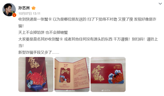 10月7日,演員孫藝洲在微博發(fā)文稱,“收到快遞是一張蟹卡,以為是哪位朋友送的。掃了下覺得不對勁,又搜了搜。發(fā)現(xiàn)好像是詐騙!天上不會掉餡餅,也不會掉螃蟹。大家要是莫名其妙收到蟹卡,或者其他任何沒有源頭的東西,千萬謹(jǐn)慎!別掃碼!謹(jǐn)防上當(dāng)!新型詐騙手段又多了……”