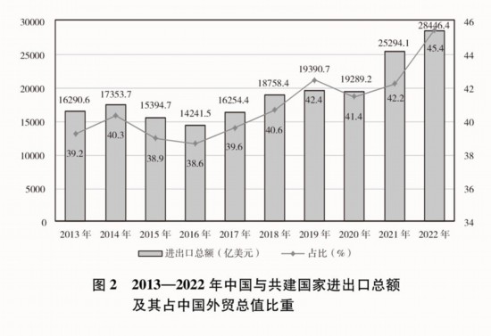 貿(mào)易投資規(guī)模穩(wěn)步擴大。2013-2022年,中國與共建國家進出口總額累計19.1萬億美元,年均增長6.4%;與共建國家雙向投資累計超過3800億美元,其中中國對外直接投資超過2400億美元;中國在共建國家承包工程新簽合同額、完成營業(yè)額累計分別達(dá)到2萬億美元、1.3萬億美元。2022年,中國與共建國家進出口總額近2.9萬億美元,占同期中國外貿(mào)總值的45.4%,較2013年提高了6.2個百分點;中國民營企業(yè)對共建國家進出口總額超過1.5萬億美元,占同期中國與共建國家進出口總額的53.7%。