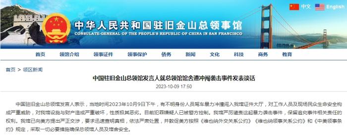 中新網(wǎng)10月10日電 據(jù)中國駐舊金山總領(lǐng)館網(wǎng)站消息,中國駐舊金山總領(lǐng)館發(fā)言人表示,當(dāng)?shù)貢r(shí)間2023年10月9日下午,有不明身份人員駕車暴力沖撞闖入中國駐舊金山總領(lǐng)館證件大廳,對工作人員及現(xiàn)場民眾生命安全構(gòu)成嚴(yán)重威脅,對中國駐舊金山總領(lǐng)館設(shè)施與財(cái)產(chǎn)造成嚴(yán)重破壞,性質(zhì)極其惡劣。