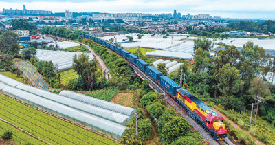 “滬滇·瀾湄線”國際貨運(yùn)班列開行首發(fā)儀式近日在云南省昆明市王家營西集裝箱中心站舉行。滿載來自東南亞地區(qū)的水果、橡膠和白糖、金屬硅等產(chǎn)品的班列,駛向上海臨港新片區(qū)蘆潮港站。圖為“滬滇·瀾湄線”國際貨運(yùn)班列駛出王家營西集裝箱中心站。
