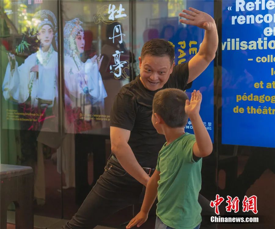 2023年9月,柯軍現(xiàn)場(chǎng)教授海外小朋友體驗(yàn)昆曲一招一式??萝?供圖