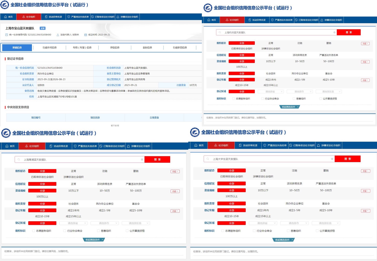 中新網(wǎng)查詢?nèi)珖?guó)社會(huì)組織信用信息公示平臺(tái)發(fā)現(xiàn),上海市寶山藍(lán)天救援隊(duì)成立登記日期為2023年9月21日,系民辦非企業(yè)單位,業(yè)務(wù)主管單位為上海市寶山區(qū)應(yīng)急管理局。其余3個(gè)組織顯示為“該組織未在民政部門登記,請(qǐng)您注意風(fēng)險(xiǎn),加強(qiáng)防范”。