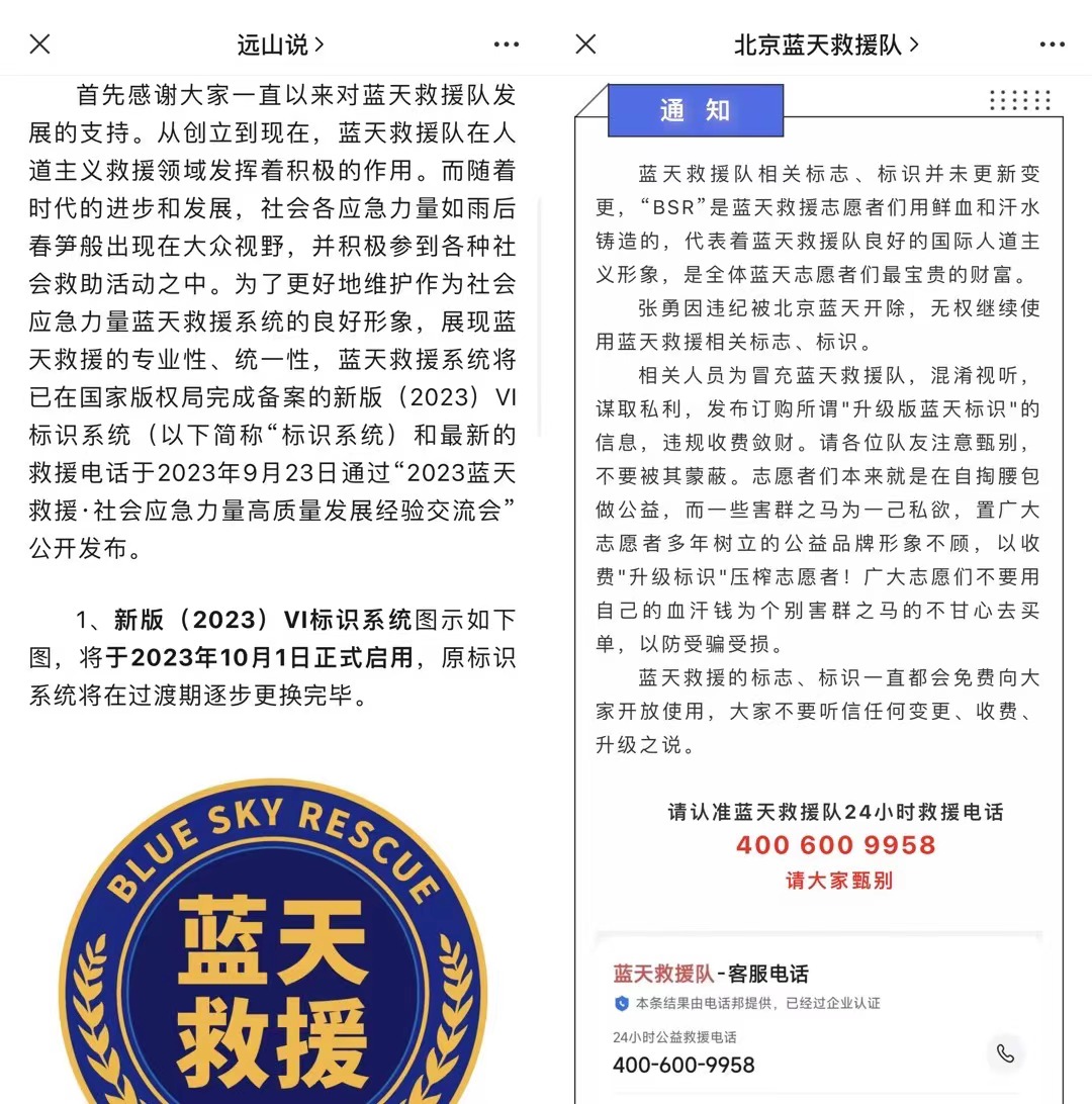 中新網(wǎng)注意到,今年9月30日,張勇在“遠(yuǎn)山說”公眾號(hào)上發(fā)布了《藍(lán)天救援關(guān)于更換VI標(biāo)識(shí)系統(tǒng)、救援電話的公告》,稱將于2023年10月1日正式啟用。就在啟用當(dāng)天,北京藍(lán)天救援隊(duì)公眾號(hào)發(fā)布信息稱“藍(lán)天救援隊(duì)相關(guān)標(biāo)志、標(biāo)識(shí)并未更新變更。不要聽信任何變更、收費(fèi)、升級(jí)之說。”