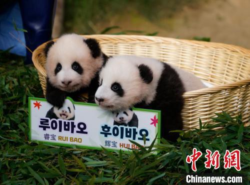 旅韓大熊貓“愛(ài)寶”“樂(lè)寶”的雙胞胎雌性幼崽即將出生滿百日。12日上午,位于韓國(guó)京畿道龍仁市的愛(ài)寶樂(lè)園熊貓館舉行雙胞胎幼崽首次公眾見(jiàn)面會(huì),并公布了它們的名字為“睿寶”和“輝寶”。