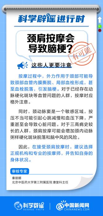 中新網(wǎng)10月12日電 按摩過程中,外力作用于頸部可能導(dǎo)致頸部血管內(nèi)膜撕脫、局部血栓形成,甚至血栓脫落,引發(fā)腦梗。在接受頸肩按摩時,建議選擇正規(guī)機構(gòu)和專業(yè)的按摩師,并告知自身的身體狀況。(來源:@科學辟謠 @中國新聞網(wǎng) )
