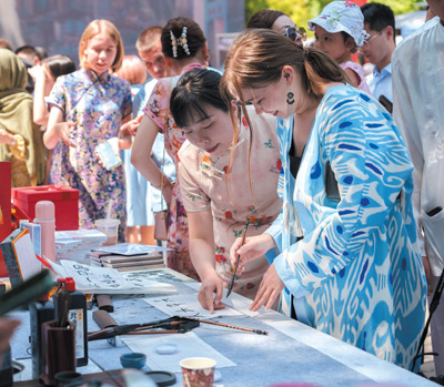5月,“茶和天下·雅集”活動在烏茲別克斯坦首都塔什干舉行,當(dāng)?shù)厥忻裨诨顒蝇F(xiàn)場通過書法、剪紙和工藝品展示等領(lǐng)略豐富多彩的中國文化。