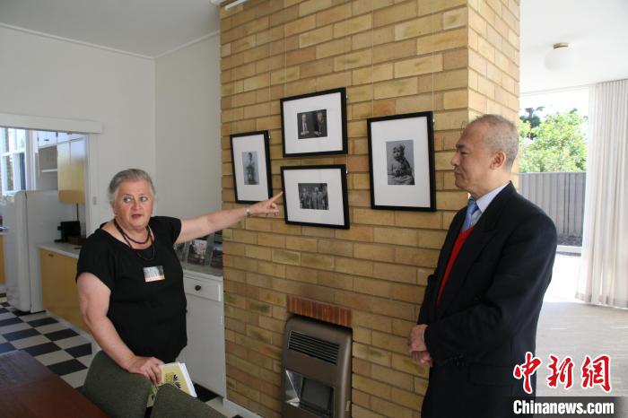 10月14日,惠特拉姆故居管理人員(左)向參訪者介紹惠特拉姆生前訪問中國的相關(guān)照片。中新社記者 顧時(shí)宏 攝