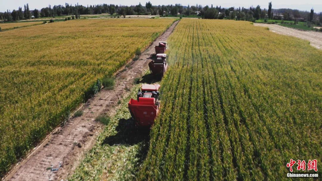敦煌市莫高鎮(zhèn)新店臺村的高標(biāo)準(zhǔn)農(nóng)田里,收割機(jī)在田地里收割玉米。郭均強(qiáng) 攝