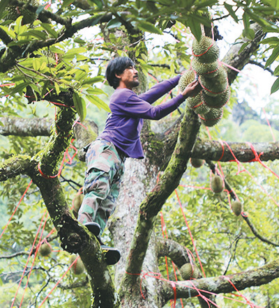 猜瓦家的果園在山坳里,記者乘車從春蓬府直轄縣駛出30公里后,從省際公路拐入狹窄的山間道路,行駛半個小時后才來到果園,一大片榴蓮樹分布在斜坡上?!傲裆徬菜荒蜐常孕逼律献詈?,這里距離海邊不遠(yuǎn),保證了濕潤的氣候,山里的土壤營養(yǎng)成分高,所以種植的榴蓮肉質(zhì)上乘?!辈峦吲d致勃勃地介紹起自家的果園。