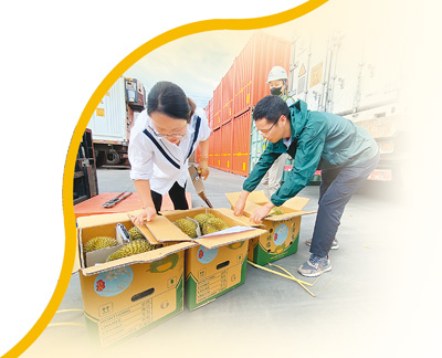 核查貨證、抽樣開箱、剖果檢查……黃中磊和同事劉奇開始按流程查驗(yàn)?!皺z查病媒及有害生物,未見異常;檢查包裝,未見異常;核對品名,未見異常;檢查標(biāo)簽標(biāo)識,未見異常……”經(jīng)過認(rèn)真查驗(yàn),兩人確認(rèn)這批榴蓮查驗(yàn)合格,可以出證放行。