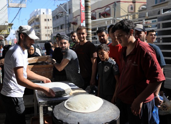 10月15日,在加沙地帶南部地區(qū),流離失所者排隊(duì)購(gòu)買大餅。新華社發(fā)(亞西爾·庫(kù)迪攝)