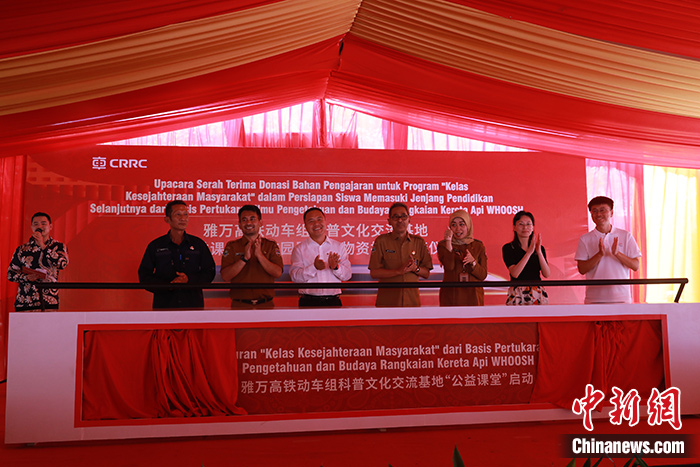 當(dāng)?shù)貢r(shí)間10月24日,雅萬高鐵動(dòng)車組科普文化交流基地公益課堂進(jìn)校園暨教學(xué)物資捐贈(zèng)交接儀式在印尼萬隆岸普拉第三國立初級(jí)中學(xué)舉行,這是中國高鐵公益課堂首次走進(jìn)印尼校園。圖為儀式啟動(dòng)現(xiàn)場(chǎng)。 中新社記者 李志全 攝